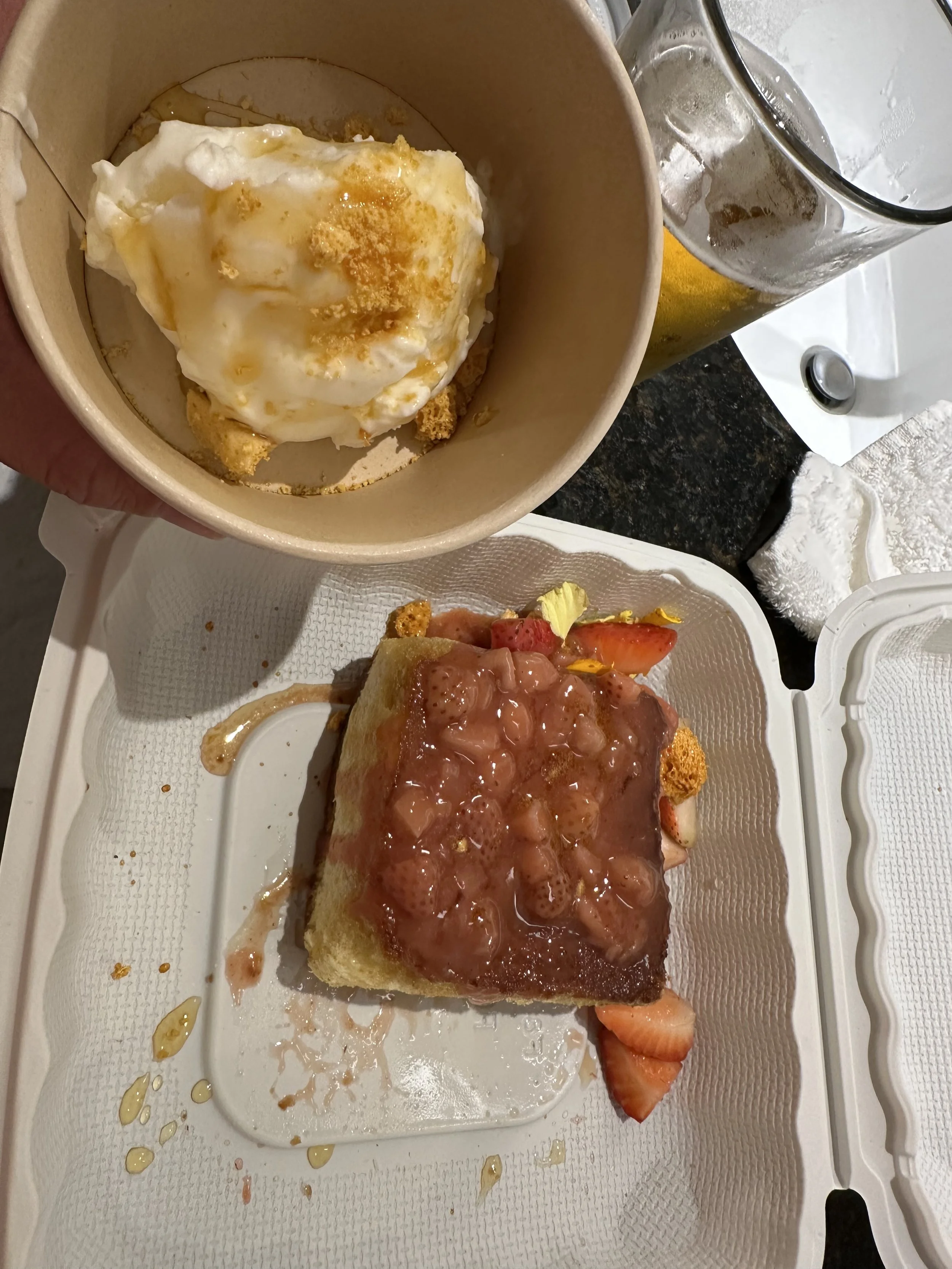 Now, for the main event: dessert. Because, of course, we had dessert. We indulged in the Milk & Honey Toast ($18), which was basically buttery brioche, dreamy milk ice cream, crunchy honeycomb candy, and a dollop of strawberry guava jam. And then there was The Chocolate Bar ($18), a decadent symphony of chocolate ganache, peanut butter crunch, salted caramel, sesame brittle, and a sprinkle of Maldon Salt. Did I take pictures of them in the bathroom because the tots were finally sleeping? You bet your sweet tooth I did!