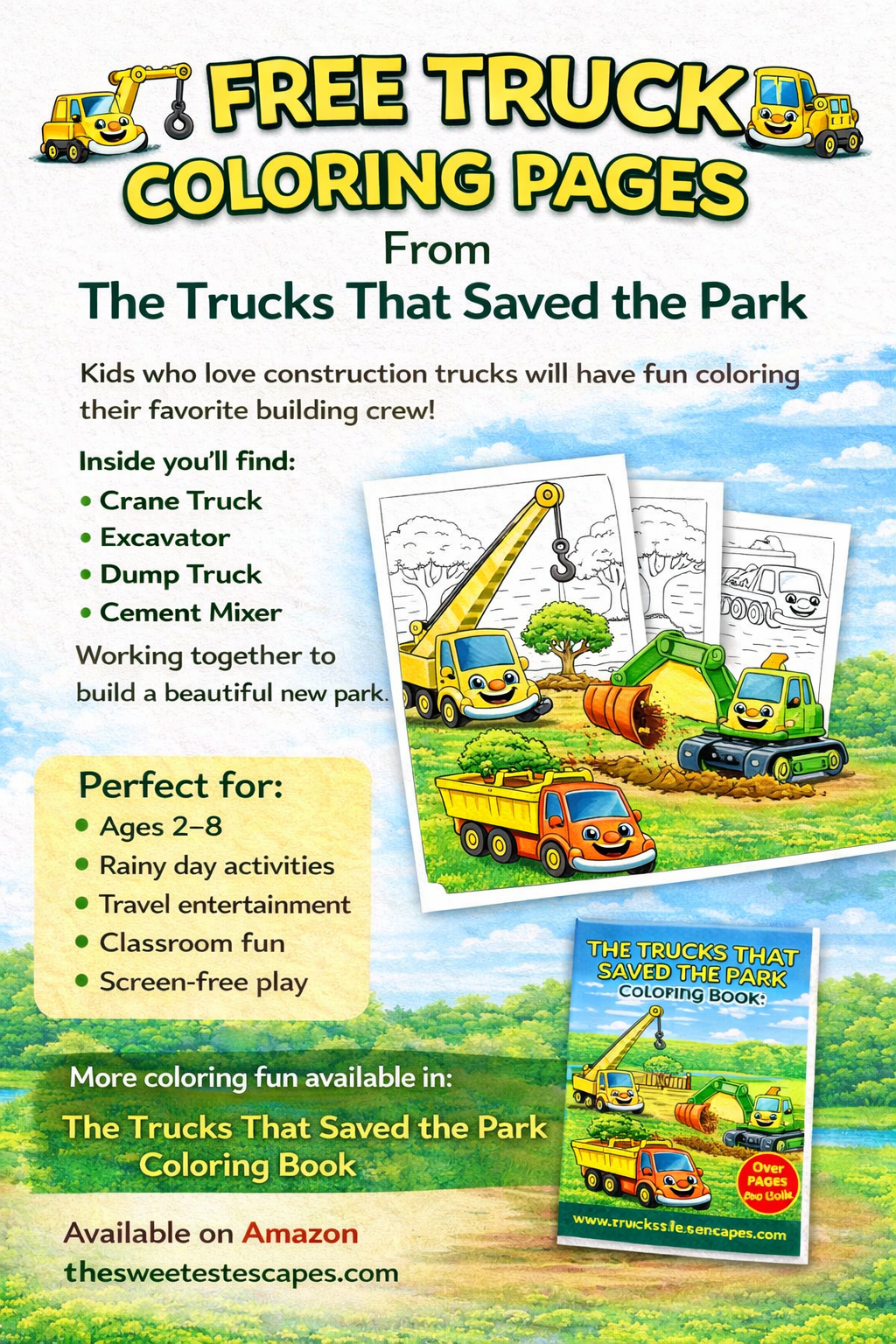 The Trucks That Saved the Park Coloring Book is a fun, kid-friendly coloring adventure inspired by the world of The Trucks That Saved the Park. Inside, kids will color their favorite building crew—Dump Truck, Excavator, Cement Mixer, and Crane Truck—as they work together to build an amazing new park.